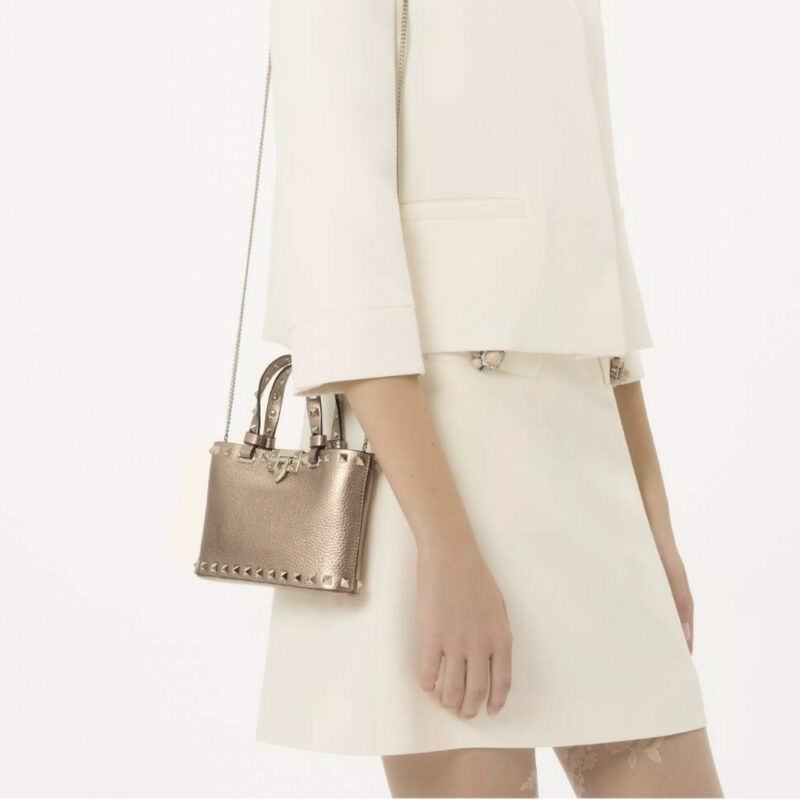 A compact icon with an edge. The Valentino Garavani Rockstud mini bag is crafted from grainy and finished with signature platinum-finish studs. With top handles and detachable chain strap, it moves effortlessly from day to night—adding just the right amount of attitude to every look.