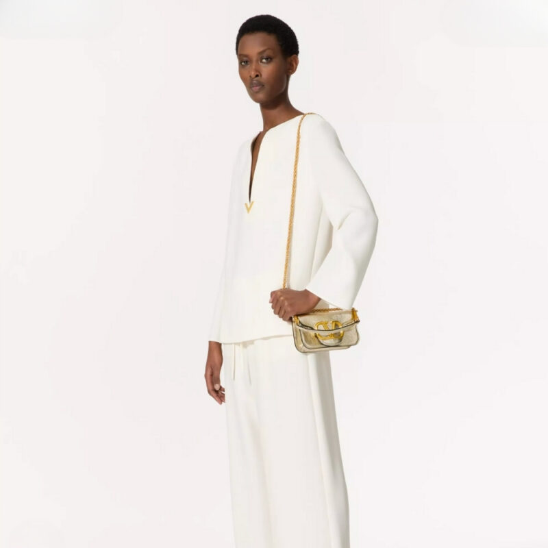 Locò Valentino Garavani small shoulder bag in craquelé-effect metallic leather with VLogo Signature element. Equipped with a detachable sliding chain strap and a removable handle, this accessory can be worn as a crossbody/shoulder bag or carried as a handbag.