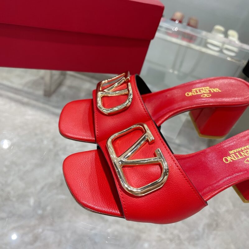 VALENTINO VLOGO SIGNATURE SQUARE TOE MIDDLE HEEL RED SLIDE SANDAL